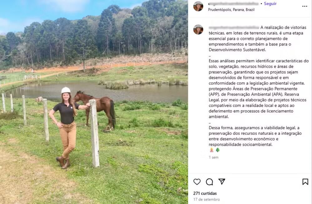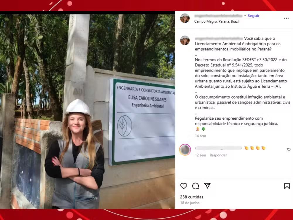 O caso ganha contornos irônicos ao analisar as redes sociais de Soares, usadas como prova no inquérito. Em postagens recentes, como uma de 17 de setembro de 2025, ela defendia vistorias técnicas para “garantir que os projetos sejam desenvolvidos de forma responsável e em conformidade com a legislação ambiental vigente, protegendo Áreas de Preservação Permanente (APP), de Preservação Ambiental (APA), Reserva Legal”. Outra publicação, de 18 de junho, alertava: “Regularize seu empreendimento com responsabilidade técnica e segurança jurídica”, enfatizando a obrigatoriedade do licenciamento para empreendimentos imobiliários no Paraná. Essas declarações contrastam drasticamente com as acusações, destacando uma hipocrisia que choca o setor ambiental.