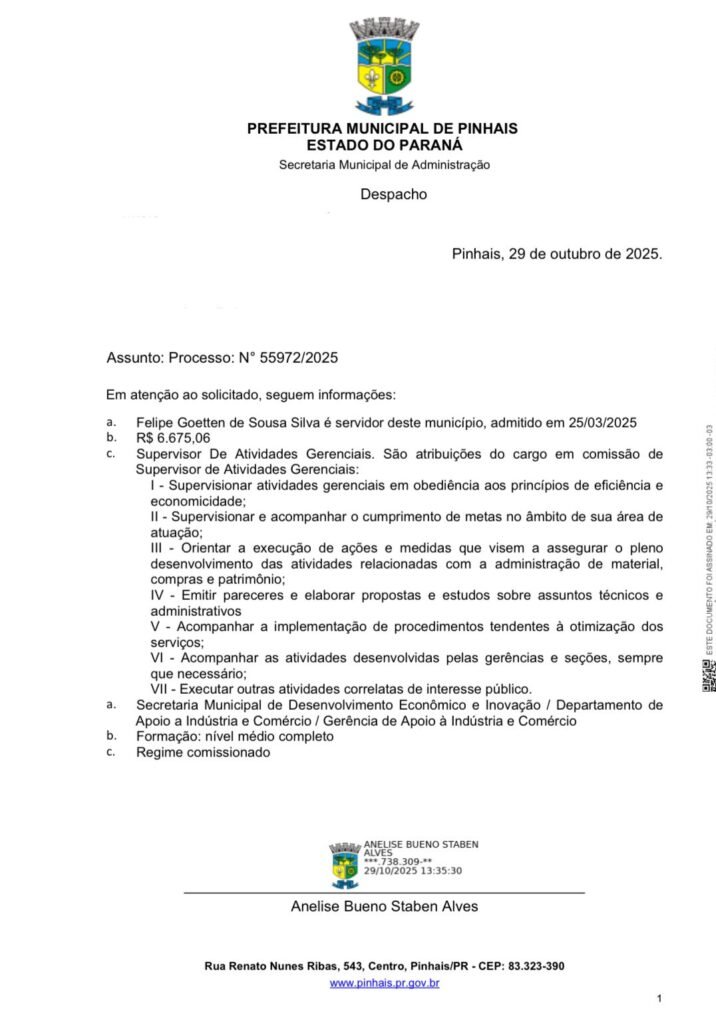 Em março de 2025, Felipe Goetten de Sousa Silva, filho do vereador Fabrício de Sousa Silva (PDT), foi nomeado para um cargo comissionado na Prefeitura de Pinhais, no Paraná. De acordo com publicações oficiais da administração municipal, a posse ocorreu no dia 25 de março, quando Felipe assumiu a função de supervisor de atividades gerenciais na Secretaria Municipal de Desenvolvimento Econômico e Inovação. O salário bruto para o cargo é de R$ 6.675,06,.
