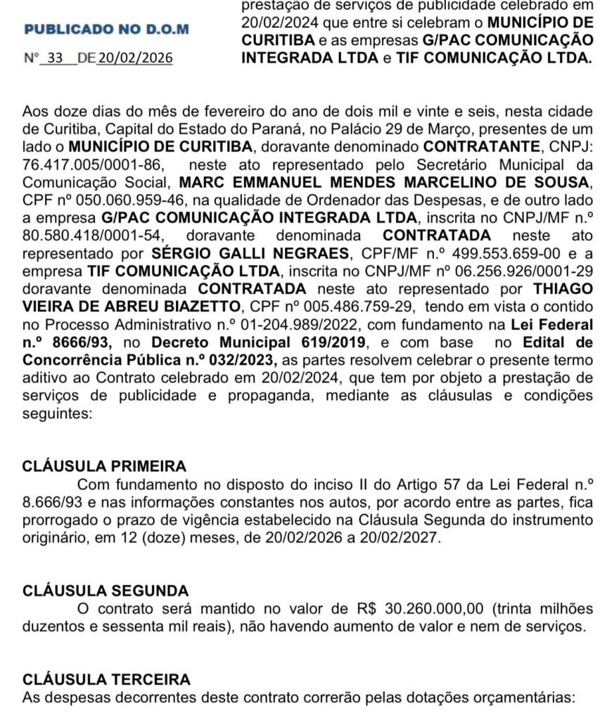 Em meio a um orçamento municipal recorde de R$ 15,4 bilhões para 2026, a Prefeitura de Curitiba optou por prorrogar por mais um ano um contrato de serviços de publicidade e propaganda no valor de R$ 30,26 milhões, firmado com as agências G/PAC Comunicação Integrada Ltda e TIF Comunicação Ltda. O termo aditivo, assinado em fevereiro deste ano e publicado no Diário Oficial do Município, estende a vigência do acordo até fevereiro de 2027, sem acréscimos no valor ou nos serviços.