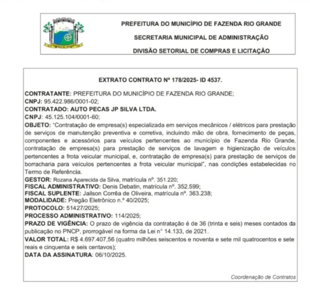 A Prefeitura de Fazenda Rio Grande, no Paraná, assinou um contrato no valor de R$ 4.697.407,56 com a empresa Auto Peças JP Silva Ltda. para serviços de manutenção mecânica e elétrica da frota municipal de veículos. O acordo, publicado no Diário Oficial do Município nesta segunda-feira (20), abrange desde mão de obra até fornecimento de peças, componentes, acessórios, lavagem, higienização e serviços de borracharia, com vigência inicial de 36 meses e possibilidade de prorrogação.